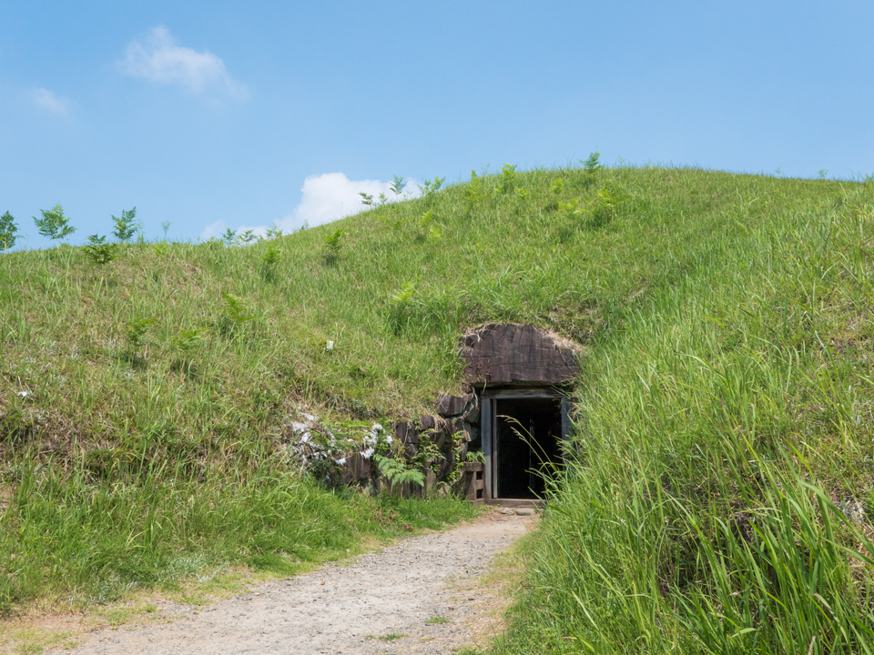 西都原古墳群のほぼ中央部に位置する「鬼の窟古墳」と称される206号墳は、直径37m、高さ7.3mの円墳で、周囲に高さ2~2.6mの土塁を巡らせた国内唯一の特色ある古墳です。6世紀後半から7世紀初頭に築かれ、西都原の古墳群で唯一、横穴式石室を有する古墳で最後の首長墓とされています。石室の天井石には畳3畳程の石が使われています。石室の規模は、羨道の長さが4.82m、幅2.29m、高さ1.8m、奥方の玄室は、長さが4.82m、幅2.29m、高さ2.15mあり、全てが加工された切石で積み上げられています。平成7年(1995)から整備を伴う調査が行われ、築造当時の状態に復元・整備されました。