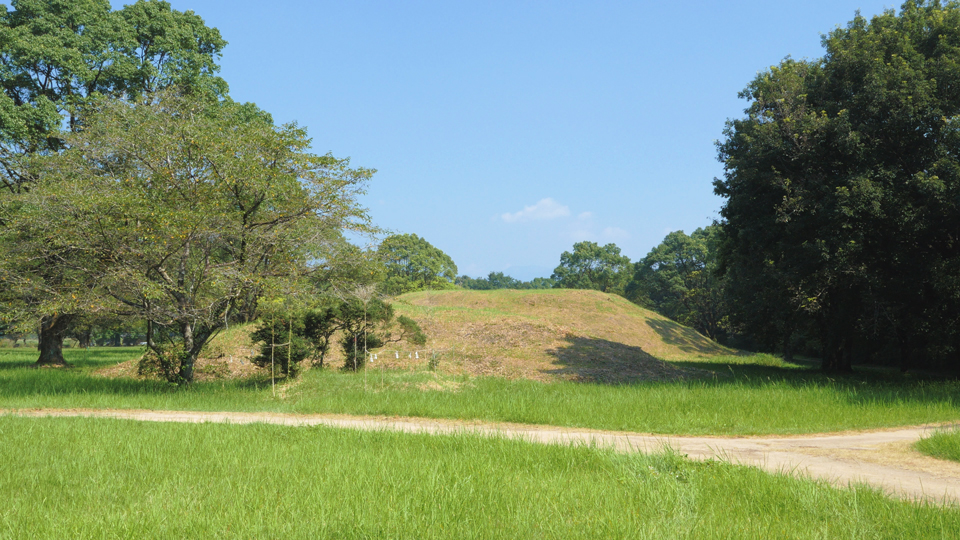 大山祇塚は石貫神社から西都原古墳につながる169段の石貫階段を登った右側にあります。4世紀の築造とされ、全長が96m、後円部径51m、同高さ7.1m、前方部幅31m、同高さ3.8mの柄鏡式前方後円墳です。男狭穂塚、女狭穂塚に次いで大きな古墳ですが、調査されていません。